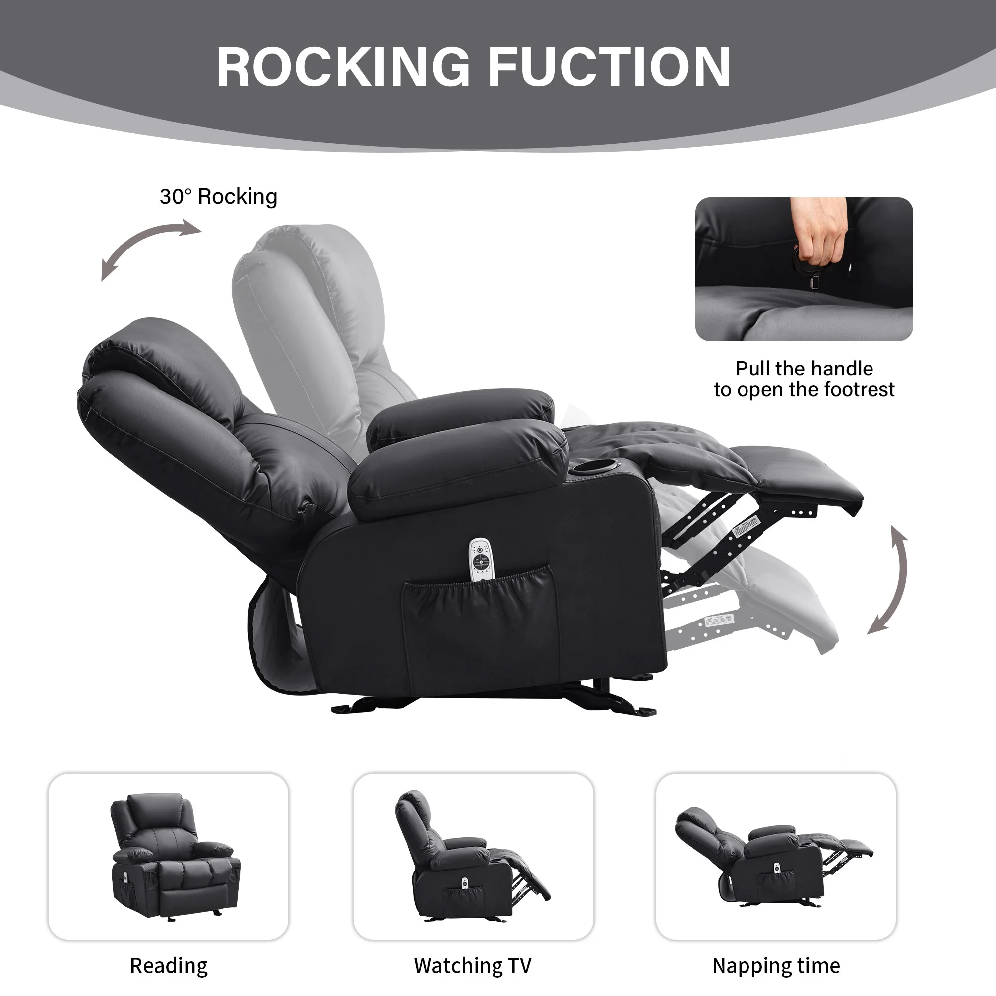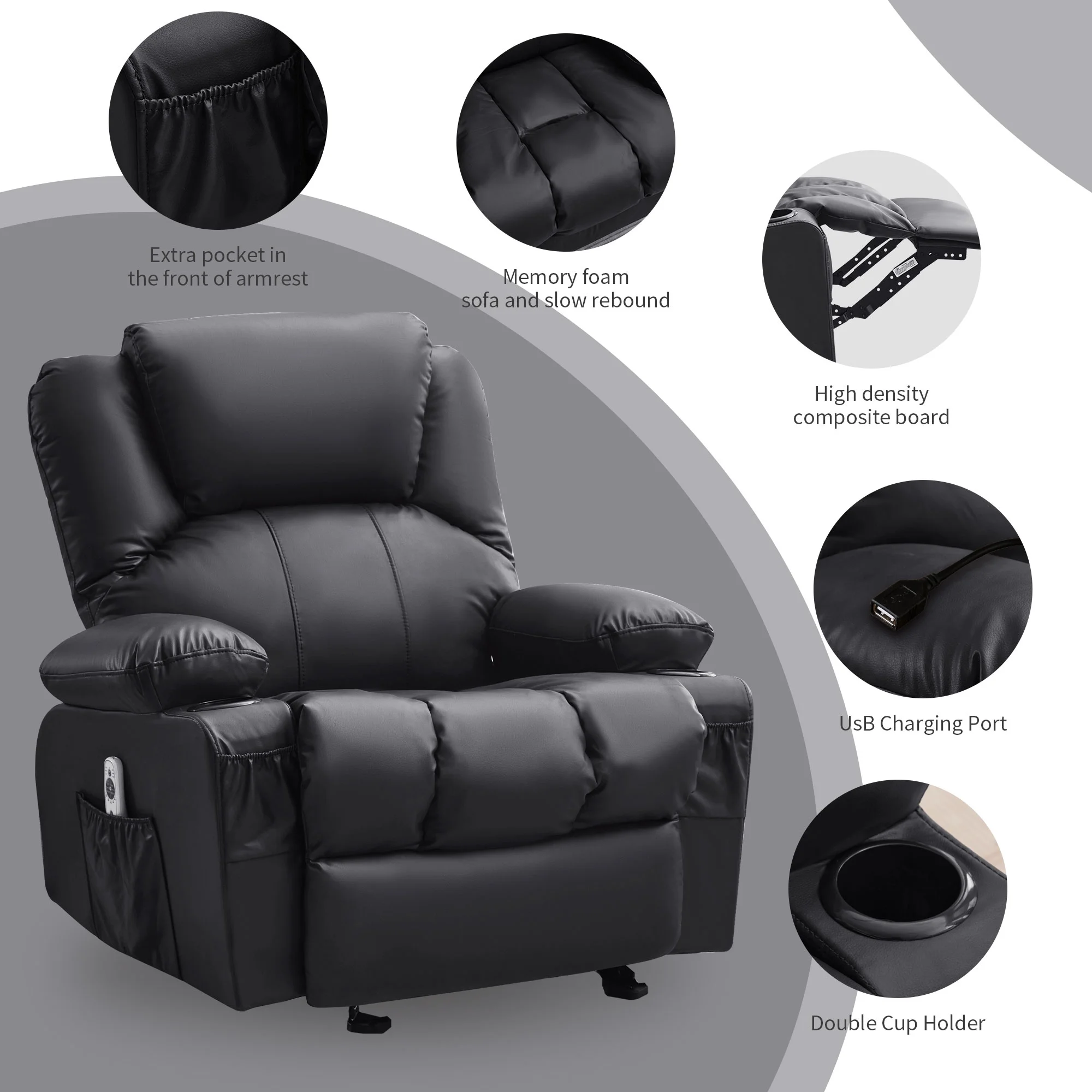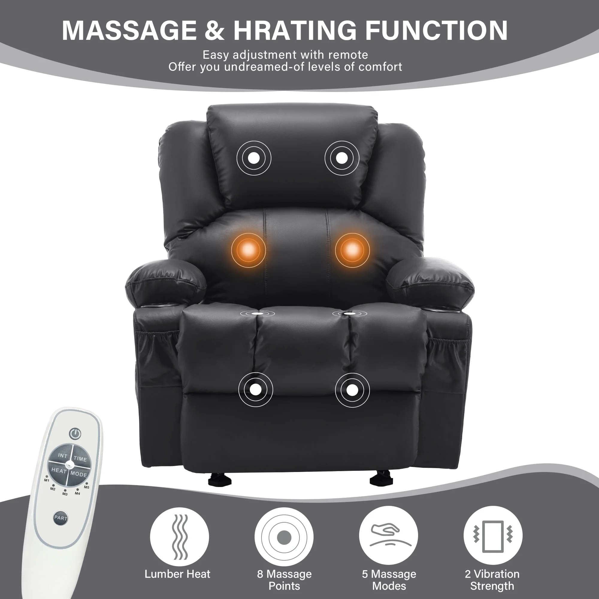• Therapeutic Comfort: Features heat therapy and an 8-point massage function for full-body relaxation, complemented by thick seating, backrest, and extra lumbar support for enhanced comfort.